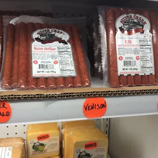 While in the area I jump on yelp to see if any meat shops were around and jack pot I have this place bookmarked already and it's literally around the corner from my breakfast spot I just left. I got there at first open so I had whole place to my self.When I walked in I thought how small it was and it was about 75% cheese to 25% meat products. They had some amazing looking fudge as you walk in if you have a sweet tooth. They have hot dogs, sausages, bacon, all kinds cheese meat logs etc etc. I don't know how much of the products are made by them but I noticed a good deal of them made by other companies, no big deal.Yes they have the hot sticks that I usually get but something exotic caught my eyes, water buffalo and venison sticks. I didn't try any cheese because I'm a carnivore, maybe one day I will try some cheese. This is not your traditional meat shop because of the lack of zillions of fresh meats/sausages so keep that in mind but if you want like meat sticks and cheese than please stop by.
