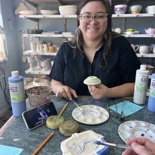 One of our favorite winter time activities! After moving to Wisconsin we realized we wanted more fun things to do which didn't involve being outside. We love to come here and paint some pieces to add to our growing collection of fun dishes at home. The staff are very helpful in introducing you to how to paint the glaze. They are dry to help when you have questions or want to try a technique like wiping off a color so there is a peeking through effect. I have brought friends here before and it's a great way to catch up and be creative as well. Yes we did have football on while we painted too.