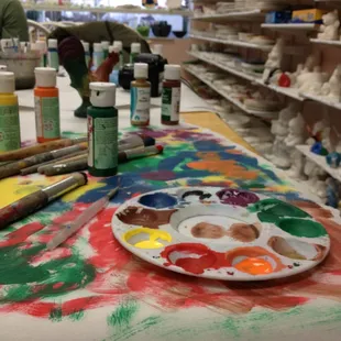 Great place to spend a couple of hours for a date or time with your kids. Hubby and I spent a couple of hours here on an afternoon date and had a wonderful afternoon.If you aren't familiar with the concept, you pick a piece of pottery (plates, spoon rests, bowls, ect.) and you paint it yourself. If you pick acrylic paint you can take it home that day, if not it takes a few days to get your item. They supply the paints, brushes and advice. Once you pick out your item (a ton of choices) then you sit down and they will bring you a choice of colors to choose from and they will bring the paints to you. I chose a coffee mug (20.00 plus a 5.00 studio fee) and hubby chose a plate (can't remember but I think it was 15.00 plus studio fee). I am totally not blessed with it comes to artistic skills and I love that they have really knowledgable staff to make suggestions and to render technique advice if needed.It took us about an hour and a half and we had a great time talking and painting. It is a small space so I could see if it was a busy day that it may get a little loud but it was slow when we were in. Our pieces will be finished by the end of the week....can't wait to see how they turned out!