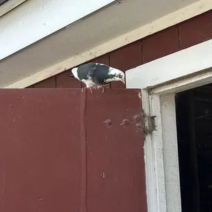 a green barn with a gray roof