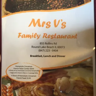 Fairly average breakfast location. Typical diner food. Cinnamon French toast is decent but not incredible. Eggs Benedict is pretty good, some restaurants provide a side of fruit but Mrs. V's doesn't include. Service is consistently good, manager is kind and personable. Interior was as expected for a breakfast/lunch location. Nothing wrong with average at all, you go once and know what to expect! Lots of parking along the building