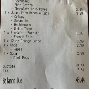 Breakfast Burrito$11.493 Scrambled eggs, fresh hashbrowns, bell peppers, diced ham and chorizo sausage rolled in a flour tortilla with melted pepper jack cheese. Served with a side of hashbrowns, our homemade salsa, and sour cream.Well, there sure weren't 3 eggs scrambled in it. The side of salsa and sour cream needs to be asked for. The bacon in the Bloody Mary definitely wasn't a good drink garnish. Totally dehydrated and broken in half.The coffee was good.The pancakes were good.The side order of bacon was definitely cooked, I mean dried out.The French Toast was pretty good.I'm glad I didn't order a fresh squeeze orange juice as are bill was already $68 before adding a tip.This was our fourth visit. We will try this one more time, before we go somewhere else.