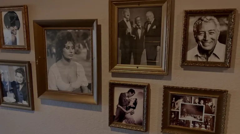a wall full of framed photos