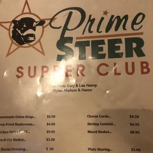 a menu for prime steer supper club