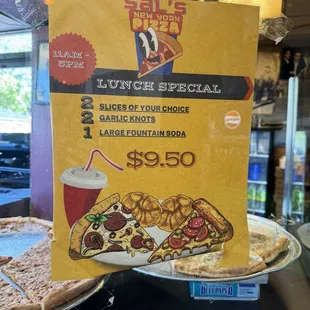I've always meant to try their pizza, decided to pull in today and see what they had for slices!It's sort of like Ian's, or maybe Ian's is like them? They had maybe 8 pies ready to choose from, pick what you want and they heat them up in the oven. The slices are large and thin.11am-5pm they have their lunch special which includes two pieces of your choice (excluding stuffed), 2 garlic knots and a fountain soda for $9.50. That's a pretty good deal, especially depending on what slices you pick. The pricing varies when you buy individually but not with the special!A perfect amount of food to share with someone you don't mind sharing a soda with.The employee I spoke to was friendly and patient as I decided what to get.The interior reminds me of college vibes, totally casual with art and written stuff on the walls. I chose to get it to go so didn't really stare too long.The pizza was pretty okay, the crust was good too. Garlic knots, eh, not my favorite but not horrible. Just more bread to eat and for me I don't want a ton of that if I'm eating a pizza that isn't thin crust. I got a side of ranch and it wasn't special, tastes like any store ranch. I'd probably go back again to try some other pizza types. They offer many options for full sized pizzas as well. But that lunch deal was pretty good!