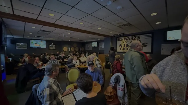 We came just shy of 3 hours to try out the infamous Schwarz's!We arrived just at 4 on a Saturday, and the parking lot was stuffed full already. Their bar opened at 3.We walked in with a dozen other people and it was already difficult to scoot around everyone. When you arrive, the bar is a giant V shape. You can go to the right, which is toward the dining room area OR you can go to the left. Along the left side are a few booths and tables for waiting. If you follow the left side along the bar, you'll come upon an entire side room further to the left. Full of tables and booths to sit at. Could definitely have a cocktail waitress or five!We got a drink right away, since we didn't know much about the ordering process before going. I asked the bartended how we order, and she said to look for a lady with menus.It took a while to get one to even LOOK at us to get a menu from. Luckily, we didn't look over the menu beforehand and really already knew what we'd be ordering. When I finally caught a hostess to ask how she knew whose order she would take next, she said, you have to put your menu in the air so she knows you are ready. I replied with we didn't have any, but we were ready anyways whenever she was. She took our order right then and there. They ask your name and party number. Then when your table is ready, they will announce it over the loud speakers.We were told it would be an hour before we go to our table, but it's wasn't even a half hour! I think stopping her and knowing what we wanted really helped speed up our time. But we didn't know the process, and it's not mentioned anywhere!When your name is called, you follow the V Bar off to the right from the entrance and toward the dining room. There is a desk before you enter the dining area and you check in there to see which table you are at.Your salads are all there waiting for you, paired with a classic supper club relish tray and rolls.We had scallops, prime rib, baked potato and fries.Everything was very yummy and our waitstaff were so attentive. I love seeing them work together! Even the teens cleaning off the tables were noticing our water glasses were empty and stepped in to help.Only place it lost a star is the lack of organization with ordering. I know it works for them, but could very well simplify it for both them and the customers by mainstreaming it a bit. A few hostesses looked distressed, but I would be too if everyone was stopping me constantly for menus and to see when they can order or what the process is.Definitely a good one to experience once, but I would hate to navigate the craziness with any additional people in our party.