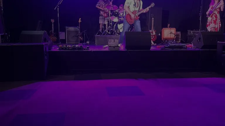 a stage with a guitar, drums, and other musical equipment