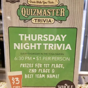 It's always highly entertaining to watch people's reactions when you tell them to meet you at Tosa Tavern, and when they ask where that is to tell them it's inside Whole Foods. :)First, the beer. Tosa Tavern regularly has tap takeovers from breweries all over the country. When they do, there are major discounts on some very hard to find beer. (We got a tulip of Dogfish Head 120 for $3.00 and were pretty sure someone was going to lose their job because of it!) The distributors always hang around to chat with you and provide some swag if you're enjoying one of their beers. The prices are insane on regular beers as well, and you're going to be hard pressed to find better prices on craft brews anywhere in town.Tosa Tavern also serves food and it's solid. They used to have loaded tots which were tater tots that were stuffed with amazingness inside the shell, but I think they moved away from that which is the saddest thing I've seen in awhile. Their sandwiches are good and their burgers are standard. They even have deals on their burgers and sandwiches on Thursday nights. As a bonus, you can literally buy anything in Whole Foods and eat it in the bar area. If you aren't feeling burgers, go grab a slice of pizza or food from their hot buffet or sushi and grab a beer. There's a couple of large tvs, charging ports under the bar, and trivia on Thursdays. As of right now Tosa Tavern is still pretty light on the attendance but I'm quite honestly hoping it stays that way. The only bummer is that they close at 9 pm when the actual store closes. So keep an ear out for last call or you'll be disappointed!