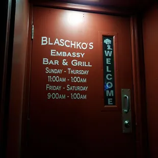 Hours of operation, front entry door.