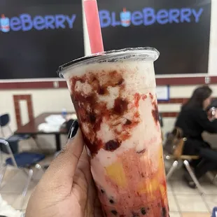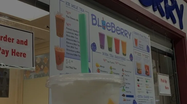 Not to be confused with an outdated phone that every Middle Class person on earth once had (Blackberry), the official fruit of Top Gun (Gooseberry), a deadly fruit (Boisonberry), a real disaster of a fruit (Razz-berry), the Cranberries fave berry (Linger-nberry), or Berry Menilow, or Berry Senders, or Berry Gordy, or Drew Berry-more.So let's start off by explaining: they don't have Bubble Tea. They don't have Boba Tea. They only serve Smoothies. Ice Blended drinks. That's it. That's all. No tea. No tea. No tea.People really don't have a clue, do they?Okay, now that we got that out of the way.I wasn't too thrilled by anything about this place. The prices are on the high side. They charge extortionate amounts for extras. The rave reviews are way overstated. Suspicious, even. Several seem fake but maybe that's just me being paranoid.It's really the only place (out of hundreds) in this amazing indoor market that has any reviews (although I did my part to fix that, and put tons of others on Yelp).And the products are very bland and very average. It doesn't seem very Taiwanese - in fact it couldn't be any more Americanized if it tried. I don't understand the hype. Maybe they hired a hype man.Then there was the line. We're talking about the 10 or 15 minute wait for average smoothies with chewy tasteless Boba and they were too expensive as well.Generally speaking, a really bad Boba place scores a 3. And I'd probably have given 3, despite their passive-aggressive, nasty signs all over the place. And other than said signs, they were friendly enough, and they're a family business, so I can't really go lower than that usually.But considering the insane hype and the near-monopoly of tons of 5-star reviews, I'd say that "overrated" drives it down to 2 stars where it probably belongs.Maybe now some more 5-star reviews will spring up and take it back "up where they belong" like Debra Winger.As for this comment from another reviewer: "Hands down the best boba tea that you will find in the Midwest or anywhere in the states."Let me not refute it, but let me just state: Blueberry only serves smoothies. They only serve smoothies. They. Only. Serve. Smoothies.In order to have the best Boba Tea, don't you have to serve Boba Tea?Yeah.