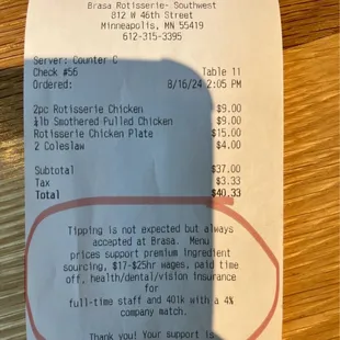 Best restaurant in the USA imo. I'm not even talking about the good food, or friendly service. I'm addressing the value of the food and finally a restaurant that is paying staff more than minimum wage, actually much more than minimum wage, plus healthcare, 401K match and PTO. Bravo!!! I applaud the management of Brasa!