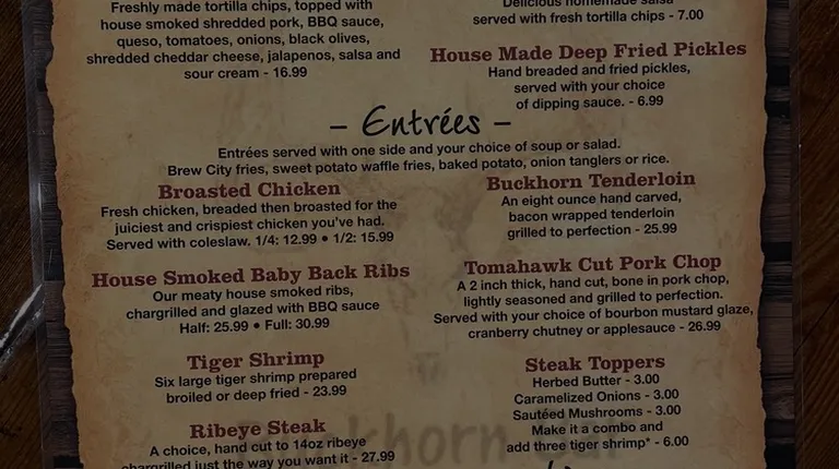 A Great place for whatever you're hungry for! Several different kinds of Burgers to choose from. I suggest the Buckhorn Burger.. From the large salad bar to Prime Rib they'll have it!