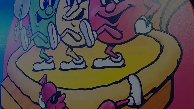 Sconce lighting with personified vegetables riding on top of a cartoon pizza. A cool hot dog nearby is admiring their work greatly.