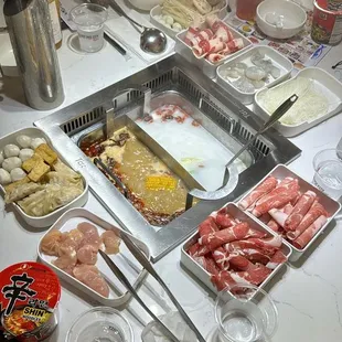 Two bases set in the heated table pot, and fresh ingredients