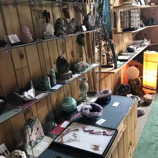 10-year-old me would have loved this shop. When I was young I went through a rock phase -- as do we all, I'm sure. I had my rock collection, kept in an army green tackle box, which included pretty gems and stones bought at stores and others I found that I thought just looked pretty.I know what you're thinking: Yes, I was one of the popular kids in school. ;-PAnyway, decades later, I still get a bit giddy when I come across tiny boxes with miniature cards in them with the scientific name of a newly polished rock originally found in nature. Hematite's pretty tight, amiright? So I was excited to stumble upon Jack Pine Rock Shop while on vacation in Hayward. This shop packs lots to look at in a small space. It has the boxes with different stones and crystals classified, along with the woo-woo mystical traits they supposedly possess. It also has some more artistic and carved pieces in glass cases to gaze upon. There were some marble items that would look pretty on a bookshelf or table as a statement piece. The prices seemed to range from inexpensive to luxury. It was fun to peruse it all, and I hope my son is as totally cool as I was when he grows up and that I can take him here to get a few rocks for his special collection.