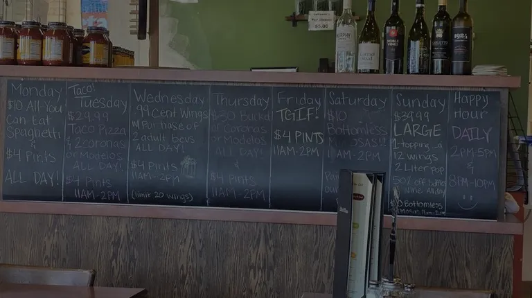 We came here on a Thursday, and took advantage of their "date night special" which included a half Antipasto salad order (enough for 2), choice of a 13 inch medium pizza (enough to bring leftovers home) or two servings of pasta, a bottle of wine (choice of Merlot or Sauvignon Blanc), and a dessert (choice of brownie or salted caramel cheesecake) for $60. In the current marketplace, I think this is a great deal! The pizza and salad were perfect; it included cheese, pepperoni, tomato, onion, bell pepper, olives, and mushrooms. The pizza is my favorite type of pizza: thin crust, with toppings to the edge, and square cut. We opted for the house special pizza which was sausage, pepperoni, and mushroom. I like the sauce a lot, and I notice they sell the sauce if you want to take it home for an at home meal. We added an order of the garlic cheese toast and chocolate mocha layer cake, because each of those options are nearly required here (trust me, they are that good)! The garlic cheese bread is made with provolone cheese and includes a zesty dipping sauce. The chocolate cake is surprisingly light and not too sweet, with a hint of coffee. I love that chocolate cake, because when someone mentions chocolate cake to me, I imagine something dense and this cake is decidedly not so; it has a layer of whipped cream between each layer of cake and is a great ending to an otherwise heavy-ish meal. We were able to score street parking in the front of the restaurant, although they do have a very small parking lot; I'd recommend snagging street side parking when you get near the location if you see an opening. The establishment is broken into two halves: one side is a restaurant with tables and chairs, and the other half is a bar with many high top tables. I noticed that the bar area has happy hour specials I'd like to check out on a future visit, as well as fun things like trivia, karaoke, and a meat raffle. There are other daily specials I plan to take advantage of on a future visit, too, such as all you can eat spaghetti (Monday), bottomless mimosas (weekend), and a large pizza with wings + 50% off bottle of wine (Sunday). We came here late afternoon, and the server wasn't very attentive; I'm going to give her a pass on this because it wasn't peak dining time and it looked like she was serving both the bar and restaurant area. Overall, this was a good dining experience and I'll be sure to add this to my rotation of pizza/pasta restaurants and/or happy hour specials.
