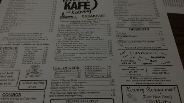 Kountry charm, we just recently moved to the area and have been slowly exploring the restaurants in the area. Our trip to the kountry kafe was excellent. The cafe itself is charming but fairly non-descriptive. Friendly service, a varied menu and quality food make the cafe a must visit when in the area. It looks like the restaurant is for sale, hopefully who ever takes over keeps the staff and the koontry charm.