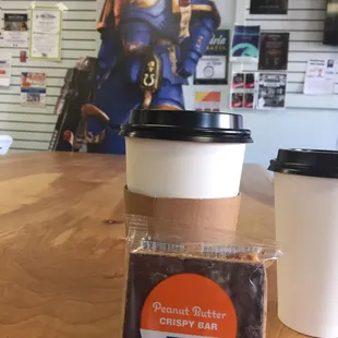 My review is of Geek Haven, the coffee/tea spot in the Level Up Game Shop. The cappuccino was wonderful (16 Oz $4.25), my Miel Special (20 Oz $4.75) was very nice. The peanut butter bar snack ($1.89) was perfect to go with our coffees.Saturday morning they offer game demos, so the cutest junior member offered to show us one of the board games.