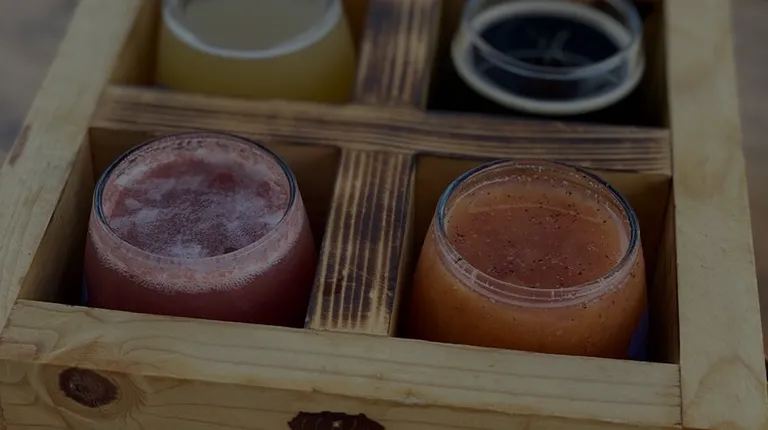 a flight of beers on a wooden table