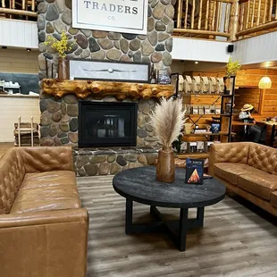 a living room with a stone fireplace
