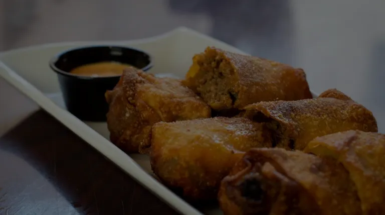 a plate of fried dumplings with dipping sauce