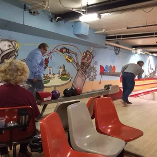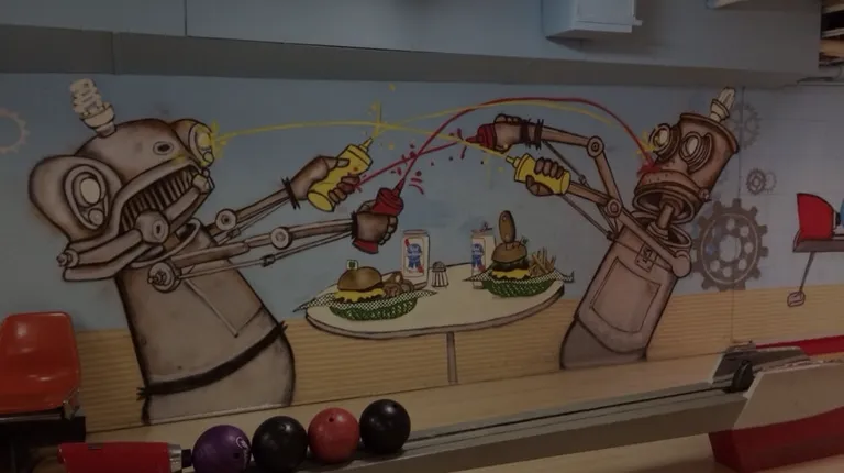 My brother, a serious bowler who is trying to bowl all the remaining wood lanes in Minnesota, and I stopped in to the Ran Ham last week. What a pleasant throwback. Going down the stairs to the lanes reminded of some of the pool halls I may have been in during my youth. We got there at about 11am, the time the lanes open, and there was already a lane in use. The lanes featured a large disco ball hanging in the middle of the room with a mural of some serious aliens spraying ketchup and mustard at each other while a couple of burgers and PBR's wait for them to finish.On to the bowling with my bro scoring a 161, 199 and 201. You will have to know how to score since you actually use a real pencil and real paper to write your scores down. The ball return was over the lane type and on one occasion we had three balls in the pit before they cane back but it didn't interfere with our game. BTW I think the lanes have been there since 1928. Once we finished we went to the bar which is to the right of lane eight where they have it glassed off. The bar area has some seating and the bar where you can order food from the Nook, which is upstairs from the alleys. Bro had a Coney Island, which he loved and I had the stuffed Philly burger, which was great. The food comes down a dumb waiter and has flashing light when food arrives. The wait staff was friendly and efficient. We both want to come back for more of the same.
