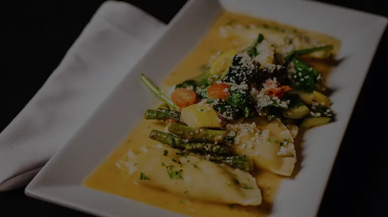 Butternut Agnolotti: Roasted butternut squash filled with Agnolotti, spinach, portebella, walnuts, marsala cream, and parmesan
