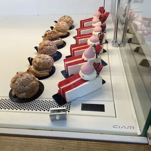 Inside this open and bright shop, there's a well-lit bakery case where beautiful creations are displayed with clearly-marked names and prices of each type. There were also some items displayed on top of the bakery case, including a whole pie, macarons, muffins, and the like. They also have a separate display counter that contains pails of different flavors of their home-made ice cream and sorbet; there's a sign posted on top that shows its serving prices. Behind the front counters is the kitchen area where those creations are prepared. During a visit on late Friday afternoon, it seemed each type of item displayed inside that pastry creations case had a $6.50 price. A scoop of ice cream is $5. I noticed that a package of 6 cookies up on a shelf perpendicular to the front counter had a $9 price.My sister and I decided to get a hazelnut cream puff and the last slice of coconut cake (we both love coconut-related creations). And since we learned they make their own ice cream, we also ordered a scoop of vanilla. The young woman attending to us began to put the baked items in a box and we asked her to instead put them on a plate because we were going to enjoy them there in the shop (glass plates are available on a table along the wall in the customer self-service area, with plastic cutlery, napkins, and coffee-related condiments). She confusedly obliged and placed the items, each on its own small black plastic base, on top of the counter. We, then, picked up the 'handle' of each base and placed one on each plate, and then had the woman place the scoop of ice cream alongside the piece of cake. Total cost was just shy of $18.We perched ourselves on the soft, fake green grass in one of their front windows and tried our beautiful desserts. We spooned up some ice cream first because, well, it's ice cream and beginning its melting process. We found it 'crumbly' when trying to cut a piece with a spoon. Once in the mouth, we found it was icy, crystallized, kind of 'crunchy' - definitely not smooth and creamy. The flavor was nice - sweet and vanilla-y.First the coconut cake. It was a slice of about 3" high, 1" wide, and 4" long. We enjoyed the flavor, with a layer of frosting (or something) between two layers of cake, with some frosting on top, and then garnished with some shredded coconut; however, the texture of the cake was dense, stiff, tough. At the end of eating this piece of cake, we found it was anchored to its black plastic base with a dollop of thick raspberry jam (or something similar). We found the cream puff delightful in appearance and flavor, overall. I don't think it was "fresh", given there was no light crunch/crispness to the cream puff shell. However, the top of the shell had a coating of something which may have softened the shell's texture, and the contents of the shell were very creamy and tasty. This item was anchored to its black plastic base by a dollop of thick chocolatey fudge (or some similar).It was fun to check out this bakery with my sister and if we visit again, we'll stick with a cream puff (if available), or try something new. Some drawbacks about this place for me are the prices, the black plastic bases (throw-away) that are underneath each of (most of) their beautiful single-serve creations, and the plastic (throw away) cutlery.