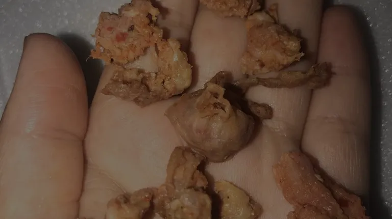 a person's hand holding a handful of fried shrimp