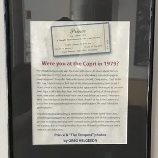 While in town I stopped by here on a Saturday afternoon in hopes that I would get to go inside and see this place. Little did I know that I would get to that and then some.Upon arriving the streets in the area were blocked off that were having a community event involving several businesses, etc. Walking up to Capri Theater was an experience in itself has I stopped by a TV crew and asked my thoughts on the event and what they were trying to accomplish. After that somewhat uncomfortable moment I made my way to Capri Theater.To my surprise it was open and the staff quickly invited me and my friends inside to experience the place. A little background on the theater; it was built in 1927 was initially known as Paradise Theater. Having gone through several renovations over the years, a renovation projected in the 1965-1967 timeframe expanded the seating capacity to ~500 and it was at this time that it was renamed to Capri Theater. Today, the Capri Theater is owned and operated by Plymouth Christian Youth Center. It seats ~300 and from what I could see, there doesn't seem to be a bad seat in the house. The focus is on continuing to be a beacon in the community where youth can find a safe and welcoming environment to explore crafts, arts, performing arts,etc. Of special importance to me is what occurred on January 5 and 6, 1979 at the Capri Theater. On those days Prince played his first shows as solo artist. Tickets to the performances cost less than $5 and proceeds from the first night went to Capri Theater. As I mentioned the staff was very, very warm and welcoming. Both James and Graham were gracious with their time; answering all our questions. They made us feel at home and mostly let us wander the place. As part of my wandering I happened to peek into the auditorium and to my surprise, the screen had a slide show going with images of Prince. As I stood in the doorway watching the slideshow, Graham noticed me and encouraged me to go inside and check it out. He said it was okay to go up on the stage and just take in the place. About that same time, he put on playlist of Prince music; needless to say, I was in heaven. In the end, my friends and I spent over an hour in auditorium, on stage and sitting in the seats just taking it all in. A BIG thank you to Graham and James for making stop/experience was the highlight of my trip. Lastly, the Capri Theater is undertaking a renovation project to expand their offering to the community. In addition to making updates there will be additional classrooms and multi-purpose spaces along with spaces for developing crafts skills such as wood working. Check their website (thecapritheater.org/) to learn more about this upcoming project. While you're there, take time to contribute to a very worthy initiative.