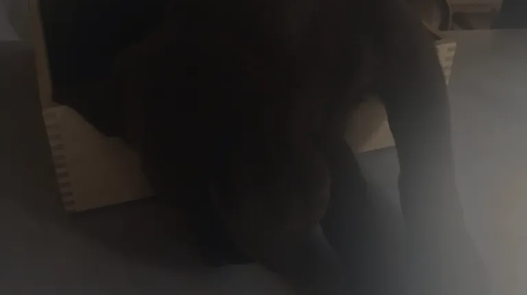 Ruby, the shop's lab, walking around on a dreary day.
