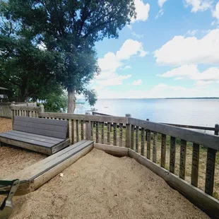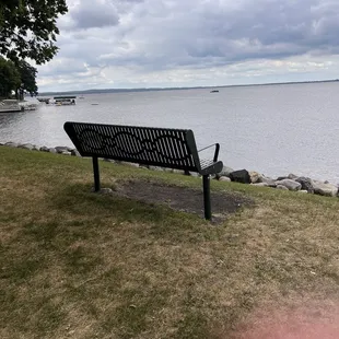 Bench in park with dock near playground