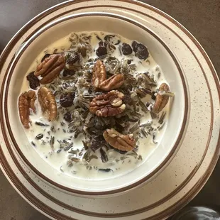 Manoomin Porridge: wild rice, cream, cranberries, pecans with a touch of maple syrup. Served hot. Extremely excellent!!