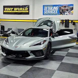 a white bmw car in a garage