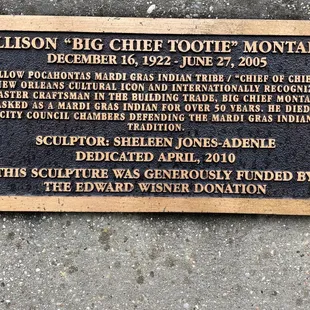 This sculpture is located at the entrance to Louis Armstrong Park. It is a very eye catching and detailed sculpture that depicts Mardi Gras Indian Chief Allison "Tootie" Montana, in full costume, with feathers covering him from head to toe. He has a flowing head dress and back piece and he is seen holding a tambourine in his right hand while striking a pose. Chief Montana was a Mardi Gras Indian for over 50 Years. Sadly, he died defending the Mardi Gras Indian tradition in the New Orleans City Council Chambers.The bronze sculpture was made by Sheleen Jones-Adenle and was dedicated in 2010. Funding for the statue was received from the Edward Wisner Donation Trust. I love this sculpture. It is New Orleans at its finest. It is very picturesque and draws you in. Jones-Adenle is also the artist that is responsible for the nice brass band sculpture right across from this one.There is metered street parking available around and in a reasonable walking distance from the sculpture. You may also find a commercial lot to park in as well.Well, as with most public art I have visited and reviewed, this is probably not a very long stop. I was there less than 5 minutes. You may want to consider planning out additional stops at many of the other wonderful art in the area to maximize your time and trip. Luckily, there are a lot of other interesting pieces of art in the park to load your itinerary with in addition to all that Louis Armstrong Park has to offer.