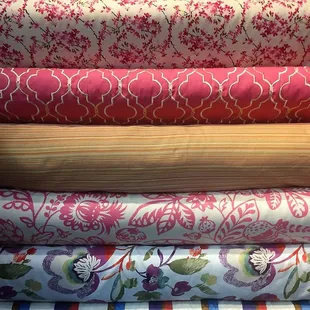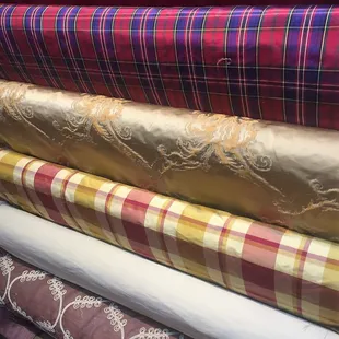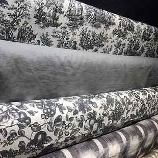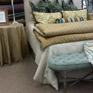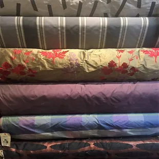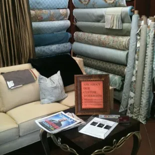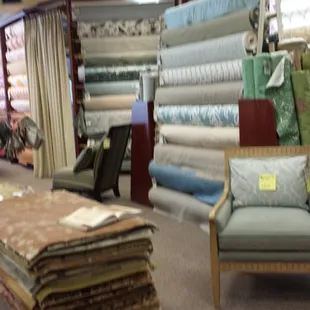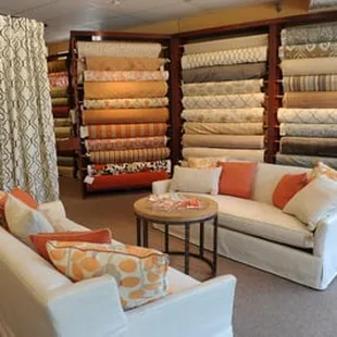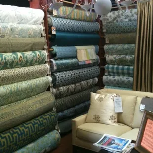 Help. I have an addiction to upholstery fabric. So much that I wanted to buy at this shop and I didn't even have a project in mind. Plus y'know I can't really sew.Seriously this shop has amazing fabrics. And they appear to offer custom sewing skills with roman shades and bedding advertised through out the store. What drew me in from the street? The cream settee with the big sale sign (see my photo). So they are clearancing some of their furniture.The store is well laid out and there is plenty of light so you can see the fabrics, which are organized by color and style. There was big selection of indoor/outdoor fabrics and a remainder and clearance section.This is one of about a dozen stores nationwide so they probably offer a bunch more stuff that I didn't even notice. I'll definitely go back...I'm still trying to figure out what I could do with superlong sheer panels with burnout velvet. They're too long/too fancy for a cape. Some sort of wall art perhaps?
