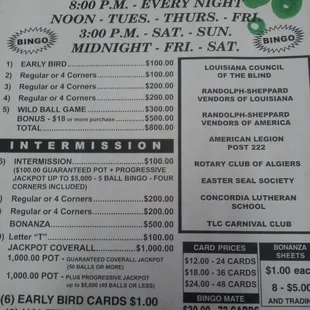 Whoooo Chile....you better not have NOTHING else to do for a few hours....these folks play PULL TAB Bingo in between the regular games....I went to the 8 pm game and I didn't leave til almost 11...lol but I had FUN!!!There books are cheaper than the other place in Gretna. There is a non smoking room and a concession stand with snacks and cookies and beer and fried fish and boudin and fries and beer and popcorn and WHEW!!!They play on the machine (which require you to do nothing but purchase it and watch for a bingo...you don't even have to key the numbers) AND on paper. It's real simple...4 Corners or a Straight Bingo wins. The people are friendly so be prepared for more noise than usual. Don't nobody care that your cell phone ringing or that you answered, baby these true Bingo players...ain't nothing gone distract them to sleep no Bingo. With the pull tab bingo it's so many ways to win that it's more fun than usual if your playing everything. True gamers know it only takes one board/ticket to win...