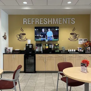 Nice waiting area with leather chairs, tv and magazines! The other side has a keurig with different flavors of coffee, chairs and tables.