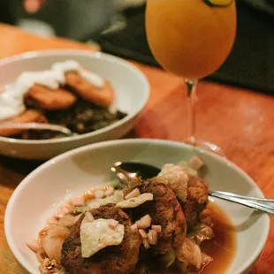 There were a bunch of us in town for a conference so this was the best spot we could find that would accommodate our big group for dinner! It was to the back in its own private room with four 10 ppl table tops. We ordered the food beforehand and it was great!We had gumbo with white rice, collard greens, grits, jambalaya, mac n cheese and some bread pudding & a tart for dessert. The food was good and I went back for seconds on the grits, greens and gumbo!They kept raising the minimum alcohol price on us for our group which is frustrating but the boozehounds we traveled with ;) ;) managed to meet that minimum with no problem!Definitely recommend for large groups!