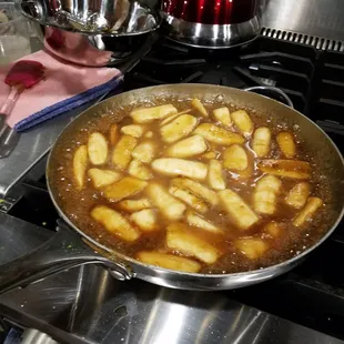 Bananas Foster - bananas sauteed in butter and brown sugar with cinnamon. Flamed with rum and served over vanilla ice cream. So delicious!