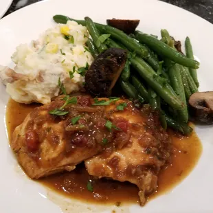 Bronzed Eggplant - the vegetarian alternative for bronzed chicken. Served with corn maque choux and smothered green beans.