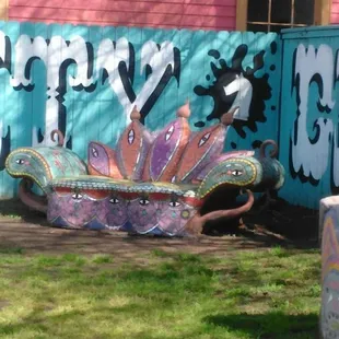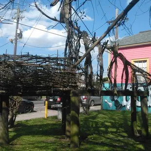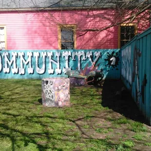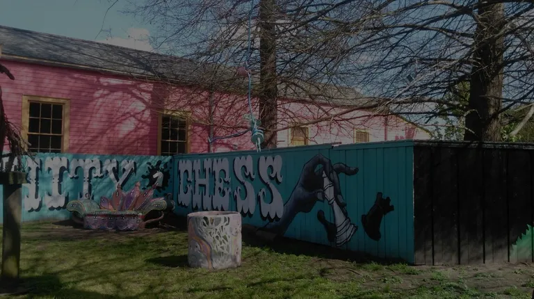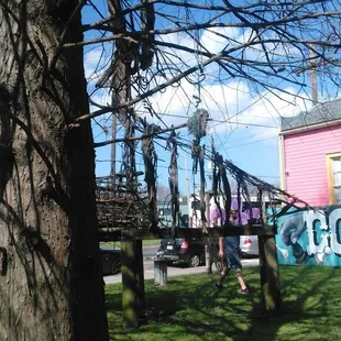 This odd spot of green space has two chess/checker tables that are ready for outdoor use (cement tables), a strange artistic metal couch, and paintings along the fences. It is quite odd. The neighborhood is in flux, a strange leaving of some of the depressed area that it once was, and then an incoming of gentrification, and I think this corner is representative of the meeting of the two extremes. It is right next to a school, and near a tattoo parlor and a co-op for a grocery, and near several bars, taverns and hipster restaurants.I'm not sure its worth more than just a stop to look, but it is interesting with the odd doll parts hanging from the tree. Make of it what you will. There are no restrooms, but I am sure people drunk from the nearby bars have urinated in the park.