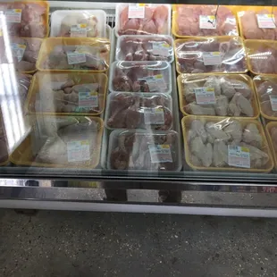 a meat display in a glass case