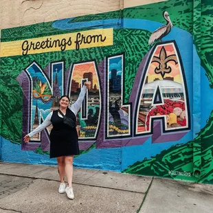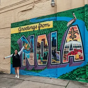 Mural address: 2104 Magazine St. New Orleans, LA 70130This mural is on the corner of Magazine and Josephine and is a ways away from the French Quarter. It is very similar to the one in Austin and other cities across the country.This is the design of the mural and the symbols of each of the letters (pulled from https://www.greetingstour.com/murals/nola):N - Masquerade Mask, St. Louis CathedralO - St. Louis Cathedral, New Orleans Skyline, Brass Band, Mardi Gras BeadsL - New Orleans Skyline, Brass Band, Mardi Gras BeadsA - Fleur-de-lis (Saints), Superdome, Crawfish BoilBackground: Mississippi River, Brown Pelican There's also a hidden alligator in the mural that I was unable to find after staring at the mural for a while. Originally designed to be the "modern postcard" this mural does a great job of displaying New Orleans' unique charm and everything that it has to offer.