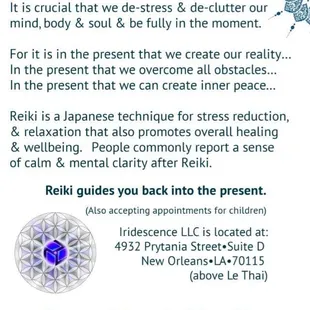 I made a visit to Iridescence Healing after feeling off, specifically unmotivated and disconnected. I knew that Met was special as soon as I talked to her. She has a vibe that is so pleasant to be around. My session was so relaxing and peaceful and afterwards, I felt so reconnected and my energy was pulsating. She gave me some advice on "aftercare" chakra work when my session was over. The feeling lasted a long time and I have since been able to reconnect to this side of myself. I have recommended her to several of my friends who are familiar with Reiki and some who are not. I would highly recommend her. I cannot wait to go back.