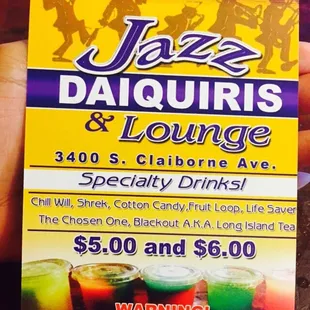 Jazz Daiquiris is the "diamond in the rough" of daiquiri shops. All of their daiquiris are strong and this is coming from a high tolerance drinker. I would definitely recommend the "house special" which is a mixture of all the daiquiris or you can try one of the many flavors. The pricing is similar to other daiquiri establishments but you get more bang for your Buck! The parking, on the other hand, can be a bit of a hassle. The side street where you usually can park is under major construction so your only option is parking in front (usually full) or a half block away. The crowd is mostly people getting their drinks to go but theirs seating available in case you want to to sit and sip. There's also a touch tunes jukebox so you are able to customize the music you're listening to. There's also a large flat screen usually tuned into ESPN or a random TV show. Overall it's a nice spot with a jazzy twist to it.