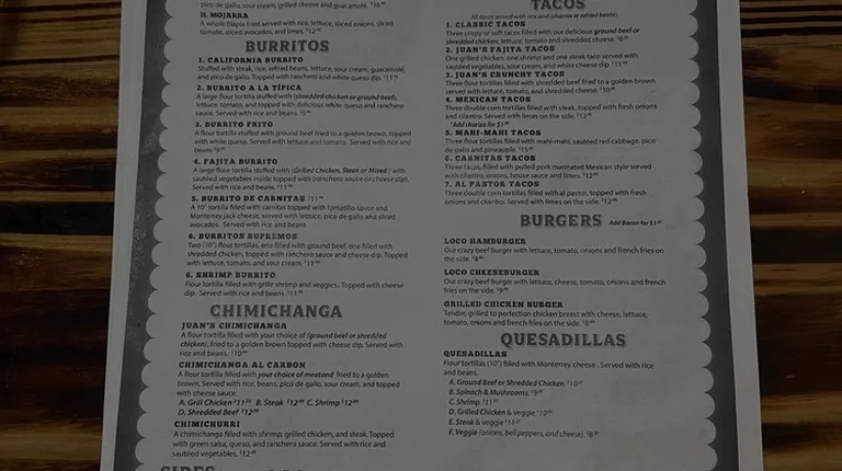 Juan Tequila's makes you feel like family. I have never had a bad experience since the staff ensure you have the best experience in a comfortable environment. There are so many menu items and they can prepare the food to your liking.