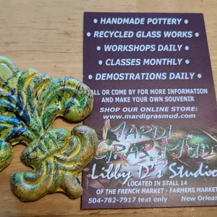 The pottery is beautiful - each is painted slightly differently, so you're going to get something essentially one of a kind. I am excited to use my voodoo cheese platter (with holes in the voodoo doll for tooth picks!) As if that wasn't nice enough, this stall is run by fantastic owners! My mother has purchased a fleur de lis magnet, and it made her remember New Orleans fondly, until (through no fault of the magnet) it got knocked off the fridge and split into five pieces. Even though it wasn't on their shop site, we were able to order a new one and it arrived today, looking very similar to the old one (but still unique). Thank you for your thoughtfulness and consideration, and coordinating this sale for my mother! Now she has a reminder of New Orleans again (but in a safer spot on the fridge)!