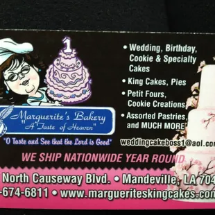 We had the pleasure of meeting THE Marguerite for a scheduled wedding cake tasting!!She offered us a warm welcome, listened to what was important to us for our big day, offered great suggestions, and made us truly feel like family.Each and everyone of her cakes were full of flavor, and were clearly homemade with love!! And you can tell when a someone is an expert at what they do when they're able to give you every detail and are truly excited to show you their work of art.We left with happy bellies, a freshly made king cake, and smiles on our faces I would absolutely recommend this bakery for everything and not just wedding cakes!!!