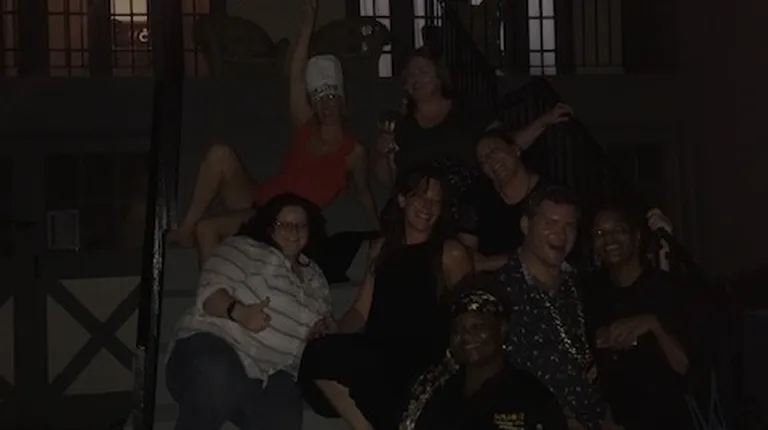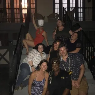 The amazing NOLA Girl serves as the backdrop to the motley birthday crew before dinner is served.